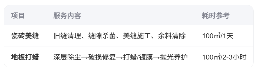 2.地板打蜡针对材质:实木地板(精油养护)、复合地板(纳米镀膜)、大理石(晶面抛光)。